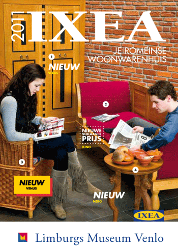 Persbericht: “Op zaterdag 26 maart aanstaande gaat in Venlo de eerste vestiging in Europa van IXEA, je Romeinse woonwarenhuis open. De winkel komt in het Limburgs Museum en blijft geopend tot en met 31 december van dit jaar. IXEA is gespecialiseerd in alles voor het Romeinse huis.”  (…) En… overal in IXEA kom je de bekende blauwe en gele kleuren tegen, waar je zo blij en kooplustig van wordt. Foto’s van beroemde designers uit Rome attenderen je op nieuwe ontwerpen. Bij de entree krijg je een potloodje en liniaal. Je volgt de routing en komt langs stellingen met aantrekkelijke season sales. Je kunt rondlopen in de keuken, slaapkamer of living van de ideale Romeinse huis. Er is zelfs een voorbeeld van een klein kantoor. Richtingaanwijzers dirigeren je via een kortere weg naar de uitgang en in het restaurant worden heerlijke Romeinse maaltijden aangeboden. De ballenbak is helaas dicht: de slavinnen die normaliter op de kroost passen,