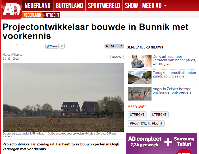 Uitspraak ingezonden door Laura Broers en Bas Le Poole, Le Poole Bekema. Mediarecht. Onrechtmatige publicatie. Zondag heeft als projectontwikkelaar van woningbouwprojecten meegedongen in aanbestedigingsprijsvragen van de Gemeente Bunnik. AD publiceert de artikelen 'Projectontwikkelaar kon bouwen in Odijk dankzij voorkennis', 'Bouwen met een luchtje'. De aanbestedingswedstrijd is niet volledig in overeenstemming met gangbare beginselen, een bepaling over nader onderhandelen is gegeven, betekent niet dat Zondag met voorkennis heeft deelgenomen. Het beginsel van hoor en wederhoor is niet serieus genomen. De rectificatie op voorpagina regioversie Utrecht en website wordt bevolen. AD moet regionale kranten, die naar aanleiding van haar publicaties hebben geschreven , informeren over de rectificatie.