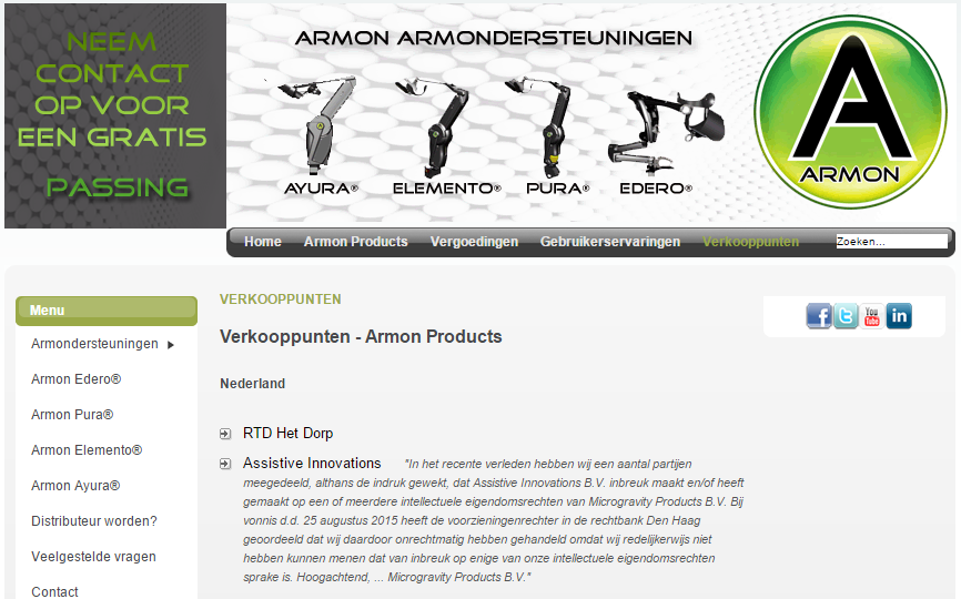 "In het recente verleden hebben wij aan een aantal partijen meegedeeld, althans de indruk gewekt, dat Assistive Innovations B.V. inbreuk maakt en/of heeft gemaakt op een of meerdere intellectuele eigendomsrechten van Microgravity Products B.V. Bij vonnis d.d. 25 augustus 2015 heeft de voorzieningenrechter in de rechtbank Den Haag geoordeeld dat wij daardoor onrechtmatig hebben gehandeld omdat wij redelijkerwijs niet hebben kunnen menen dat van inbreuk op enige van onze intellectuele eigendomsrechten sprake is.