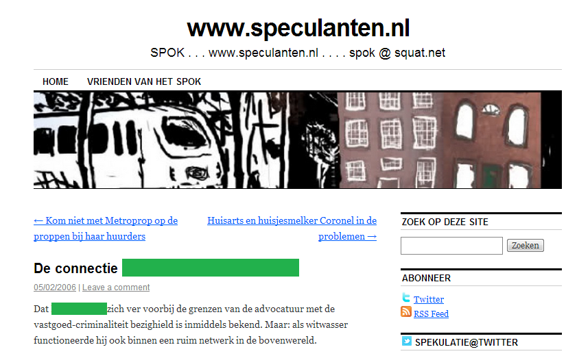 De Stichting is domeinnaamhouder van de website www.speculanten.nl. Het feitelijk beheer van de website vindt plaats door het Speculanten Onderzoeks Kollektief (SPOK). Het SPOK stelt zich ten doel om misstanden in de Amsterdamse vastgoedmarkt en horeca aan de kaak te stellen, alsmede het gemeentelijk beleid te dier zake kritisch te volgen. In juni 2011 is op de website een artikel geplaatst onder de titel “De [Appellant sub 1] connectie”. Medio november 2011 hebben Appellanten dit gemerkt en zich hierover via hun advocaat bij de Stichting beklaagd. Daarop zijn enkele aanpassingen in de tekst van het artikel aangebracht.