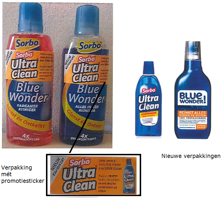 5.16. De voorzieningenrechter constateert dat de tekst "Ultra Clean" op de actiesticker in een vergelijkbaar lettertype en grootte is als de tekst "Blue wonder" op het etiket van de fles (Sorbo) Blue Wonder en voorts dat de actisticker zodanig op het etiket van de fles is geplaatst dat de tekst Ultra Clean pal boven de tekst Blue Wonder staat. Door deze wijze van bestickering lijkt het alsof de naam van het Blue Wonder-product wordt gewijzigd in Sorbo Ultra Clean. Met de bijgeschreven tekst op de actiesticker dat Sorbo Blue Wonder wordt vervangen door Ultra Clean wordt de indruk versterkt dat Blue Wonder-producten geheel van de markt zullen verdwijnen. (...)
